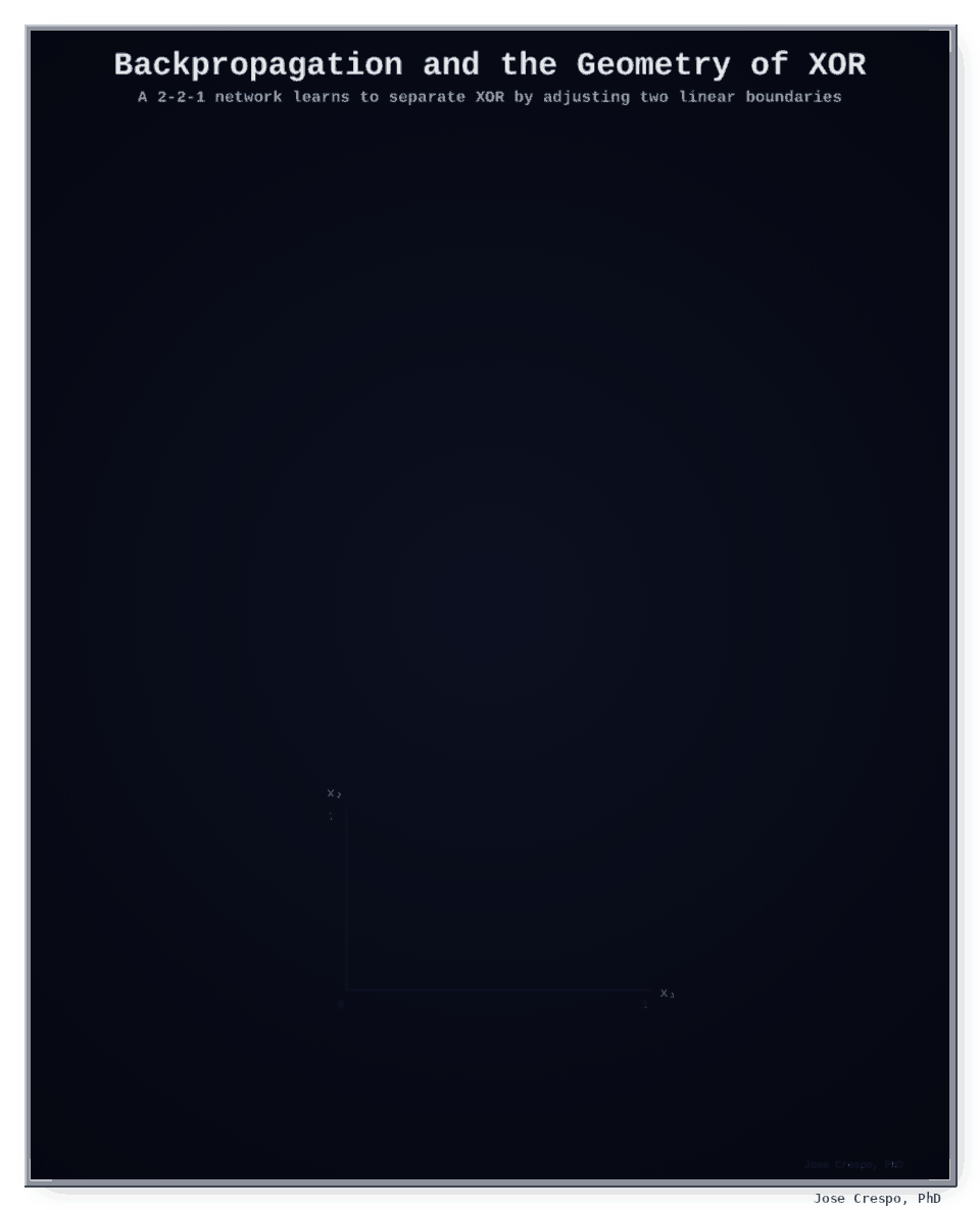 Now watch the animation… you can see it clearly: backpropagation escapes the perceptron’s old XOR trap not by bending the geometry, but by learning enough straight cuts
