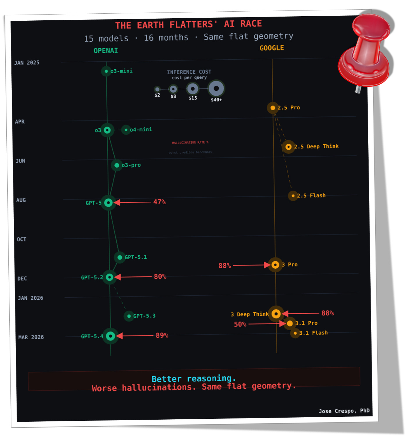 Look at the chart below: green for OpenAI, gold for Google. Each launch comes wrapped in marketing rhetoric. Each model is sold as a leap, yet under the hood it does the same thing as the last: thinking longer, searching harder, hallucinating more, and burning more money at inference time
