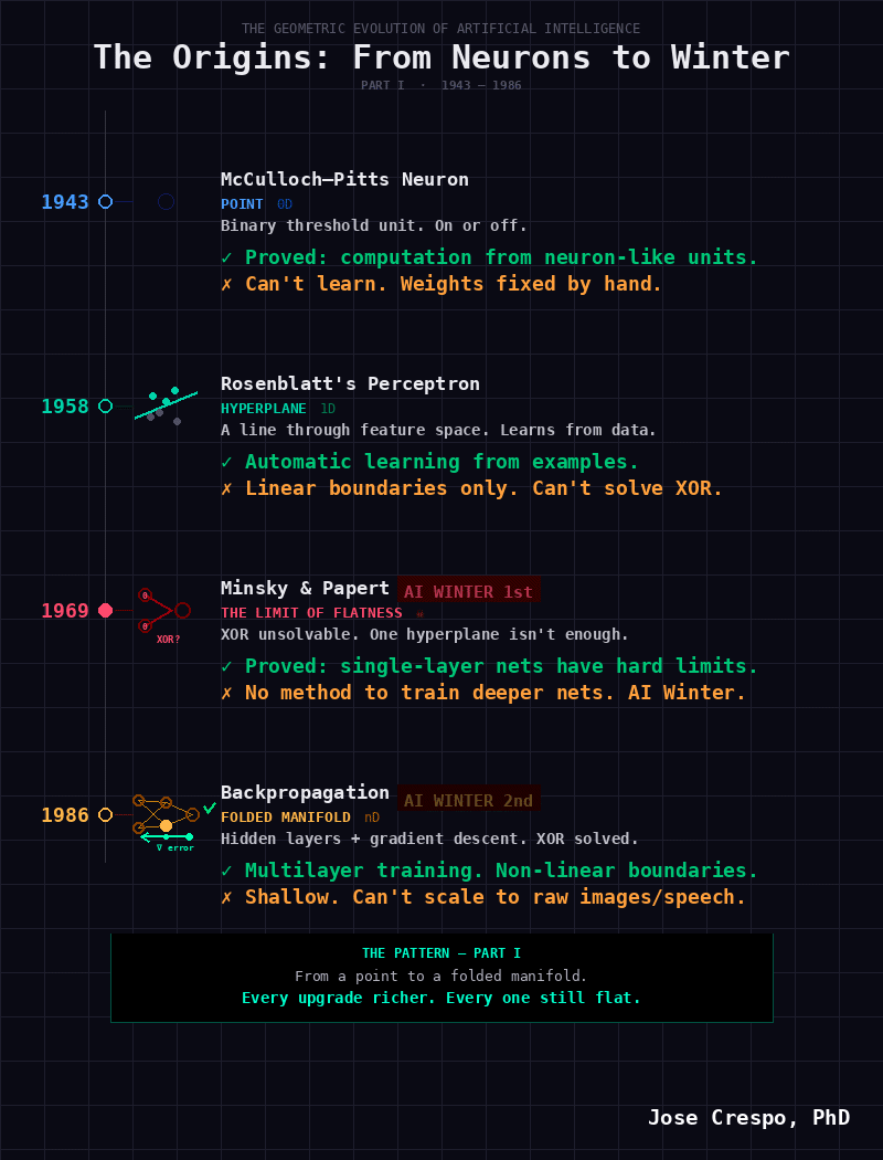 The XOR problem was solved. The field celebrated. But here is the part nobody talked about at the celebration: backpropagation did not bend the space. It just learned to make more cuts inside the same flat geometry. The geometry never changed. Only the bill did.
