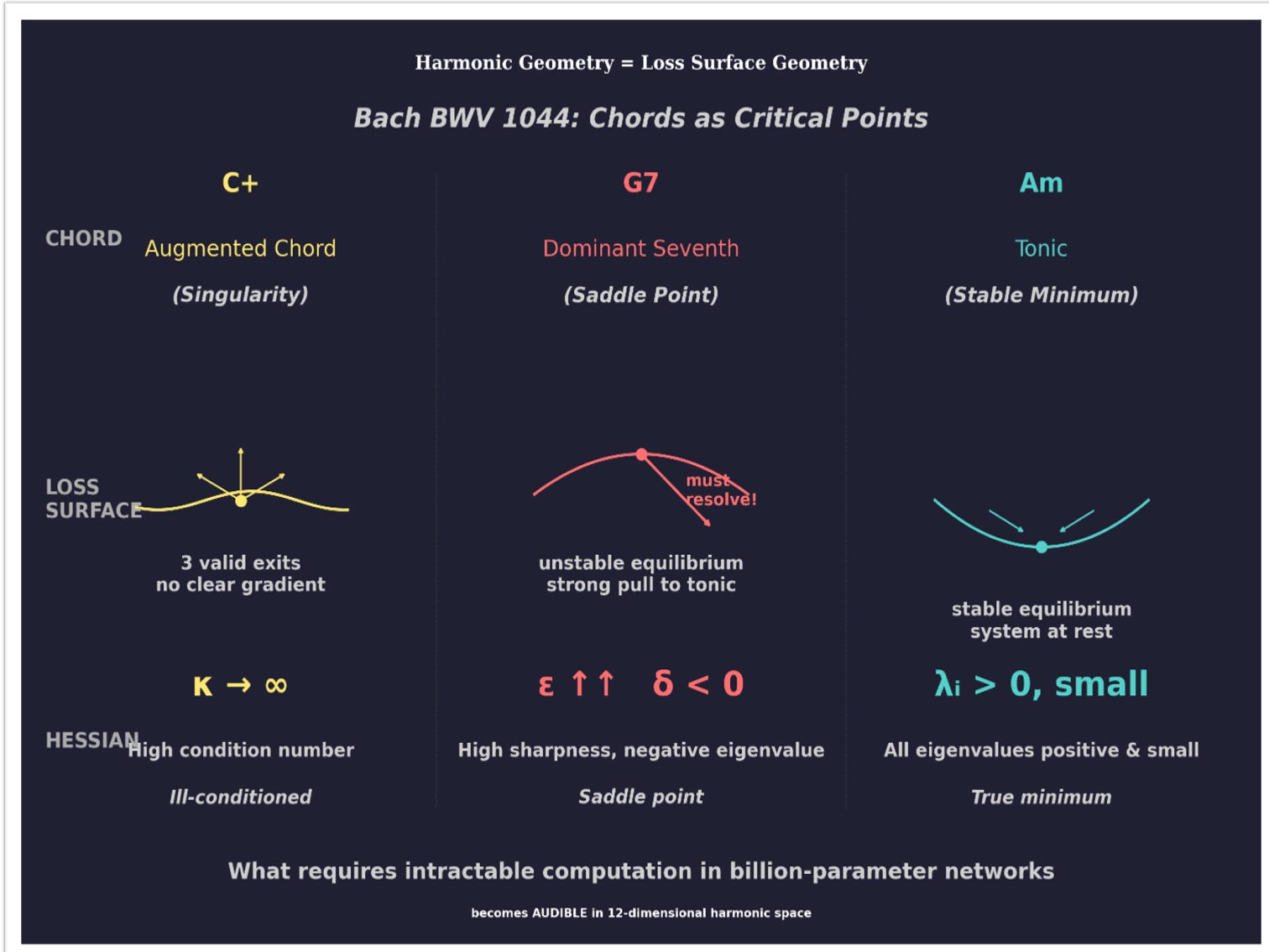And here the practical consequence of our Bachian Holonomy: Nobody can visualize a billion-dimensional loss surface. But the old Bach will help us here by simplifying our work space where, regardless of the dimensions, size of our AI neural network, and number of tokens, we can capture the relevant curvature structure in a way that’s cognitively manageable and visually representable.