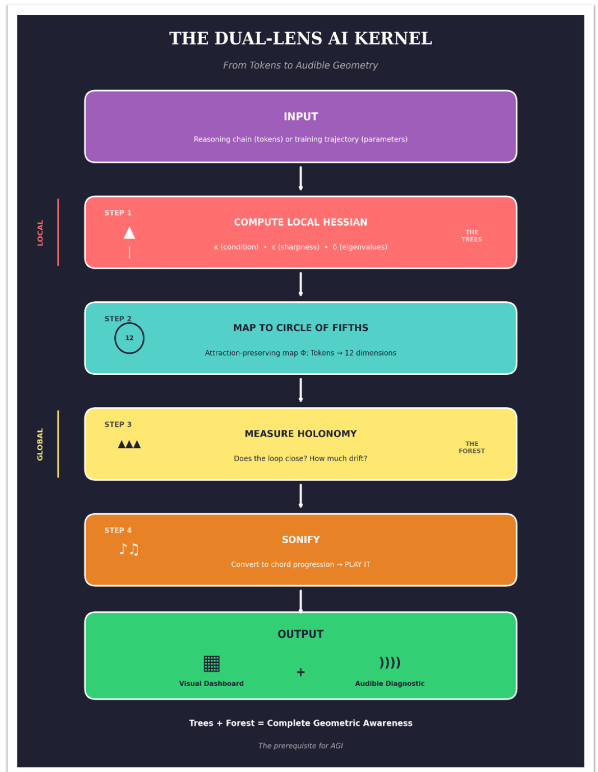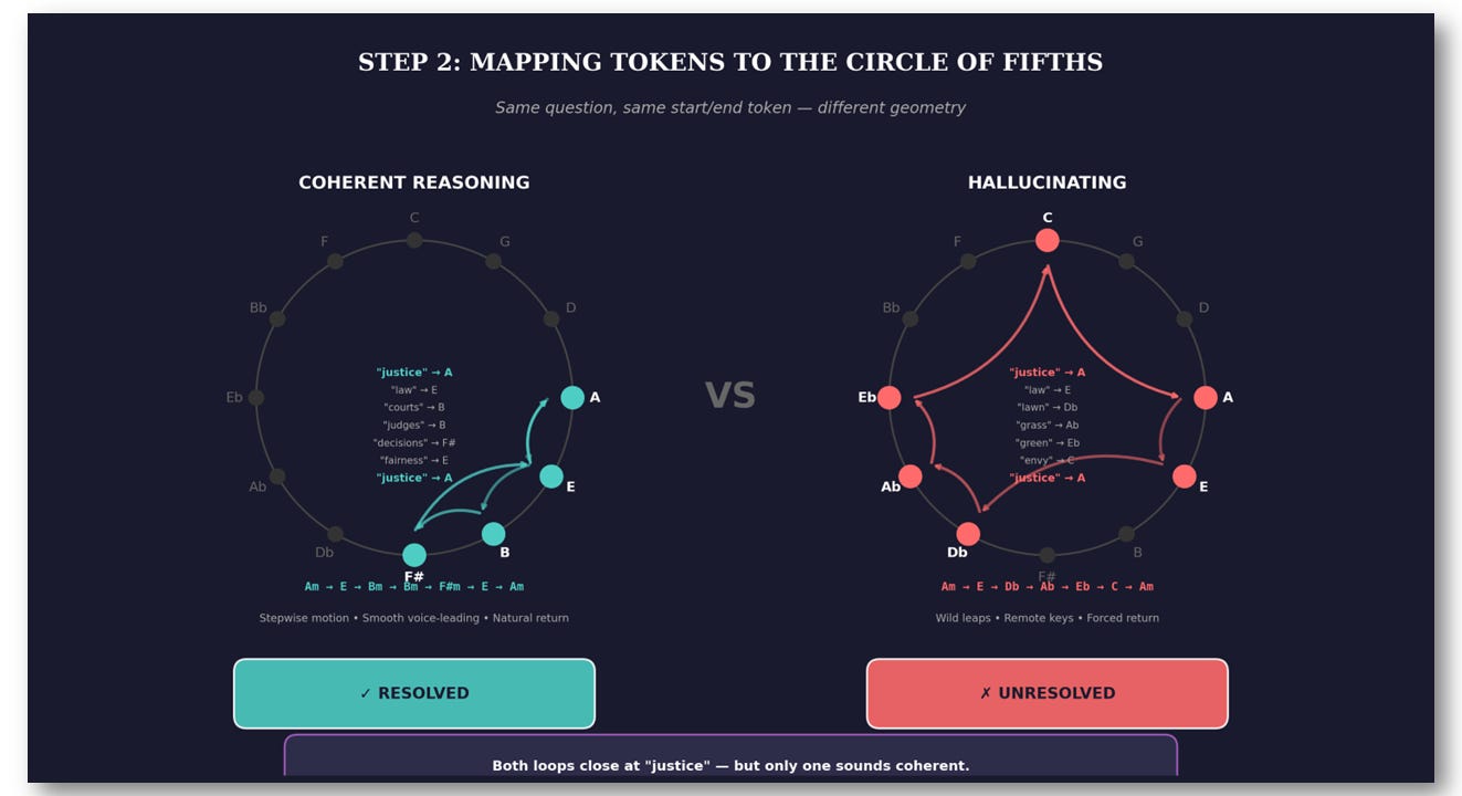 When a progression returns to tonic with zero drift, the holonomy is trivial: flat geometry, closed loop, coherent reasoning. When it fails to return — when the comma accumulates, when meaning drifts — that’s measurable curvature. Detectable. Audible.