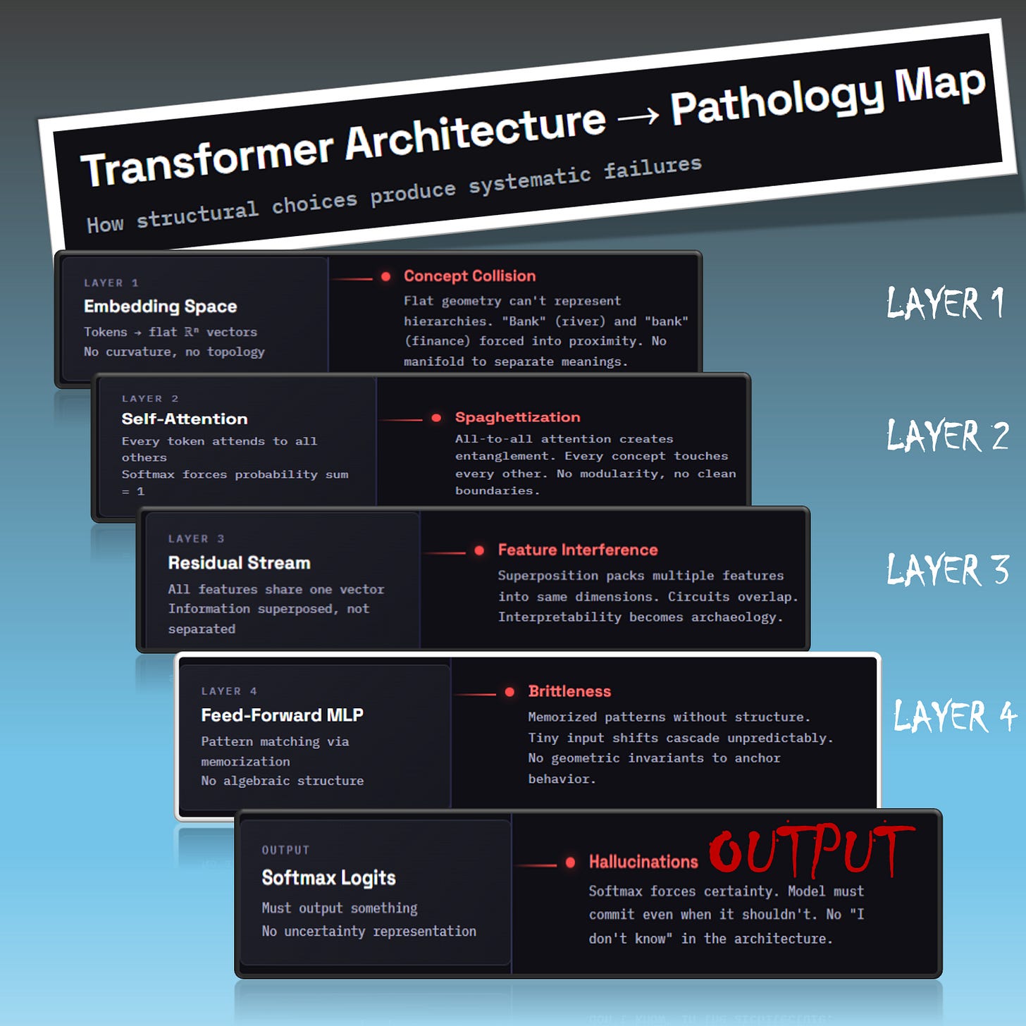 These aren’t mysterious emergent behaviors: they’re receipts. Every failure mode has a return address. Here’s the transformer architecture that powers your chatbot, your copilot, your search engine, with the damage traced layer by layer: