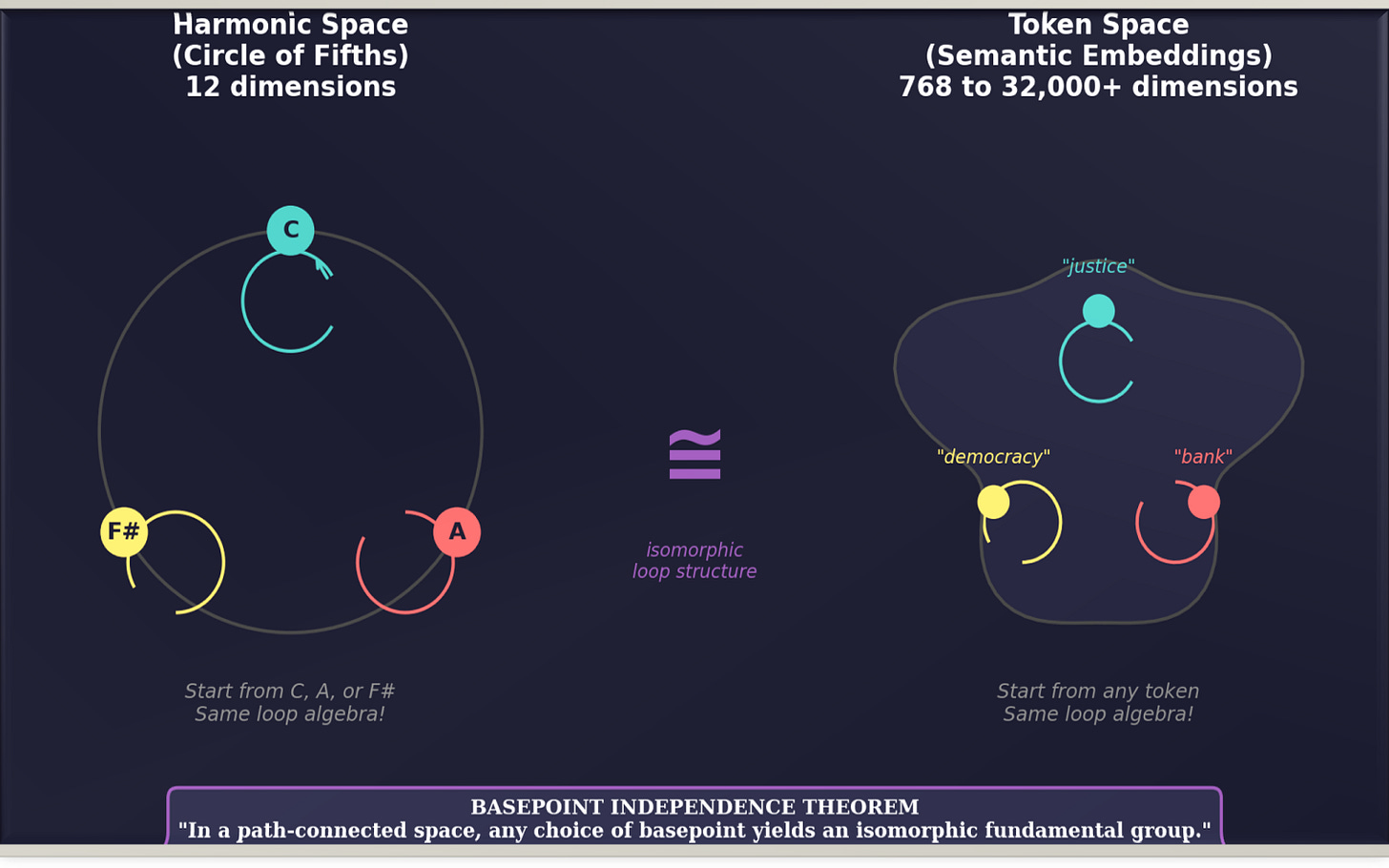 In plain english: it doesn’t matter which pitch you start from, or which word. The algebra of loops is intrinsic to the space itself. Start from C or A or F#. Start from “justice” or “bank” or “democracy.” The loop structure is the same.