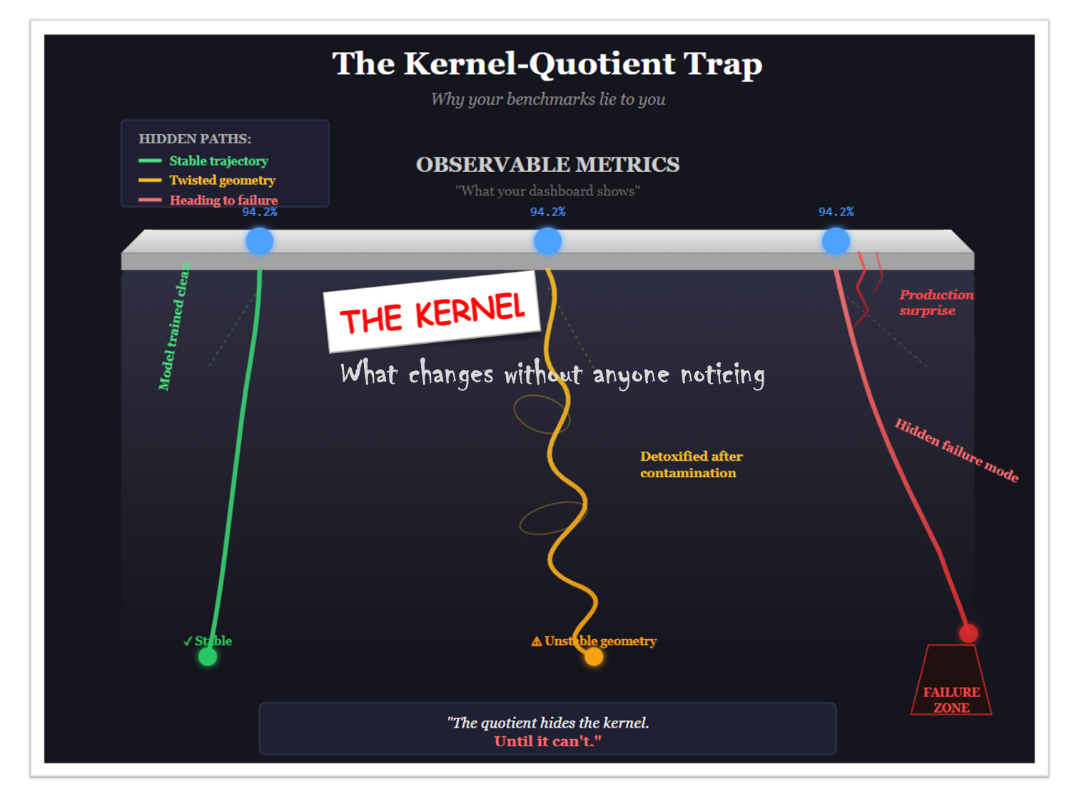 Said another way: the kernel-quotient trap is written like a story where three characters start in the same place, and the narrator only tells you where they end up: never how they got there. They all arrived at 94.2%, the story concludes. But one walked a clean path. One spiraled through contamination. One is inches from the cliff. The ending looks identical. The journeys were not. And journeys determine what happens in the sequel. See the visual translation in the figure below: