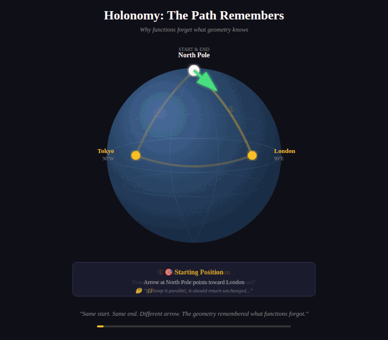 The path rotated it. The geometry of the sphere induced a transformation that pure function from start to end cannot see.
