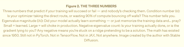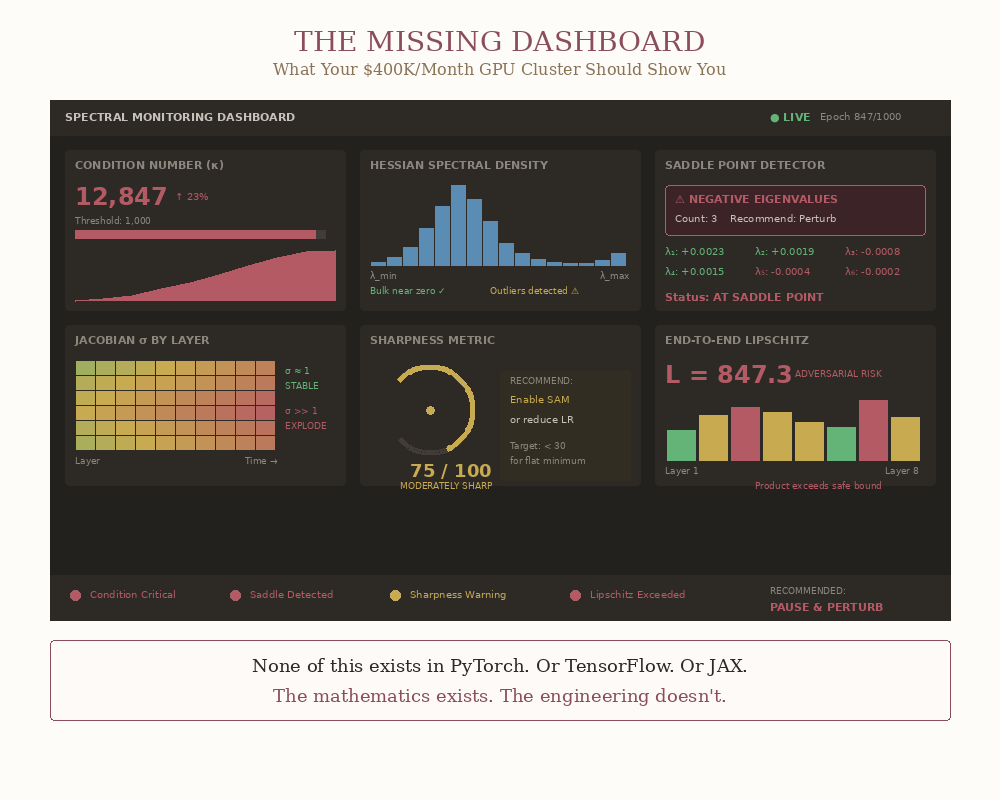 Because the people who understand spectral theory are in math departments writing papers nobody reads. The people building frameworks are shipping features that look good in demos. And the people training models are too busy babysitting loss curves to ask why they’re babysitting loss curves.