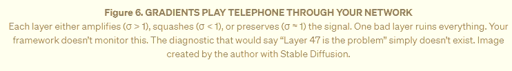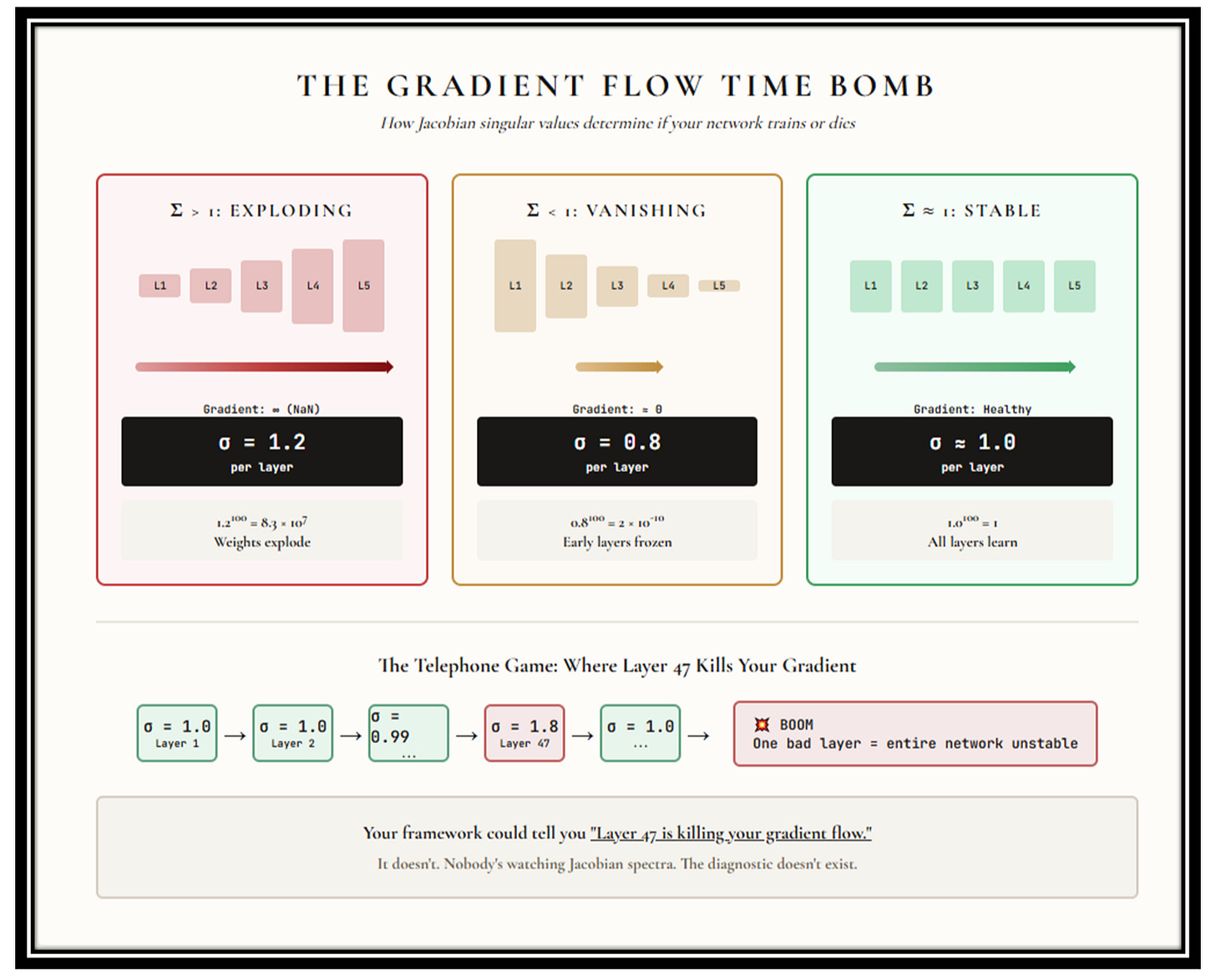 But here’s the thing: these techniques were discovered by accident and applied as band-aids. Nobody monitors Jacobian spectra during training. Nobody watches the singular values drift. The diagnostic that would tell you: Layer 47 is about to kill your gradient flow 😁, simply doesn’t exist in any commercial framework.