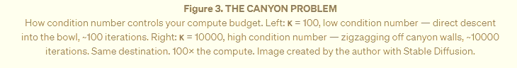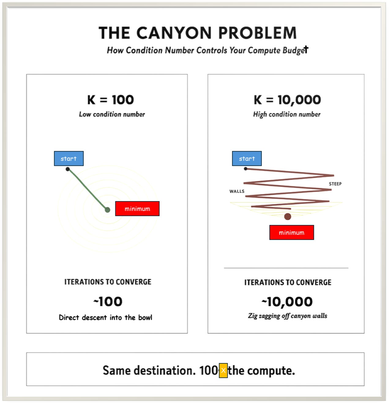 The figure below shows exactly what’s happening. Same starting point. Same destination. One path takes ~100 iterations. The other takes ~10000 — zigzagging off canyon walls while your GPU burns money.
