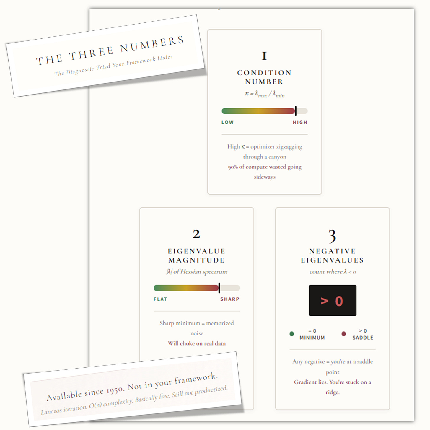 And here’s the absurd part: the Hessian is fully computable. It’s sitting right there, screaming diagnostic data, and nobody’s looking at it.