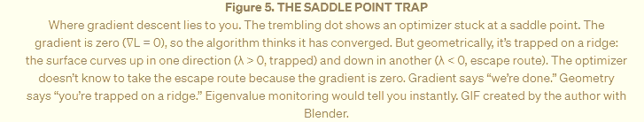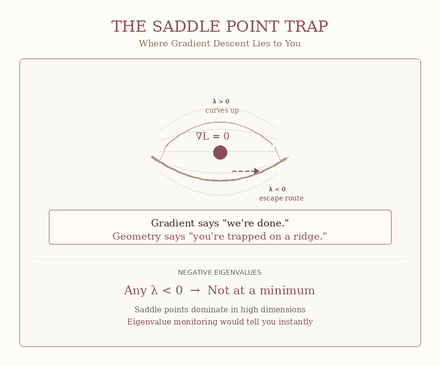 The bad news: “eventually” might be three weeks of wasted compute. Degenerate saddles — where eigenvalues hover near zero — create plateaus where the gradient whispers instead of speaks. Loss goes nowhere. You’re stuck, but you don’t know if you’re stuck or just slow.