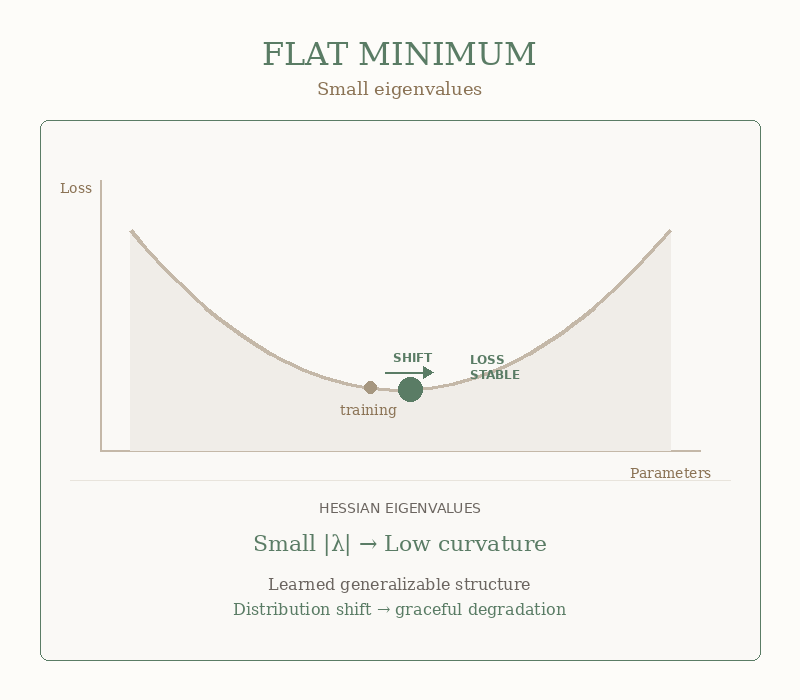 Picture your loss landscape as terrain. A flat minimum is a wide valley — you can wander around and the elevation barely changes. A sharp minimum is a knife-edge ridge — one wrong step and you’re tumbling into the abyss.