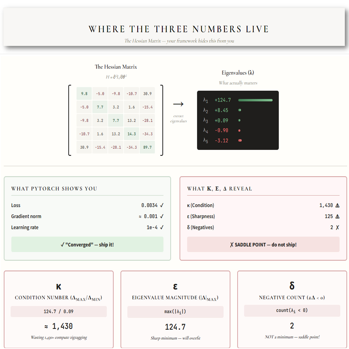 On the right: what κ, ε, and δ reveal. Condition number through the roof. Sharpness off the charts. Two negative eigenvalues. You’re not at a minimum: you’re stuck at a saddle point pretending to be done. 💀